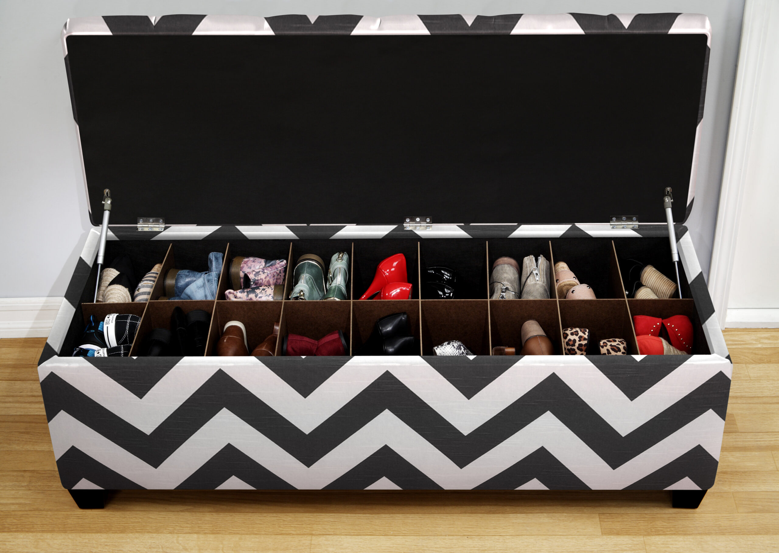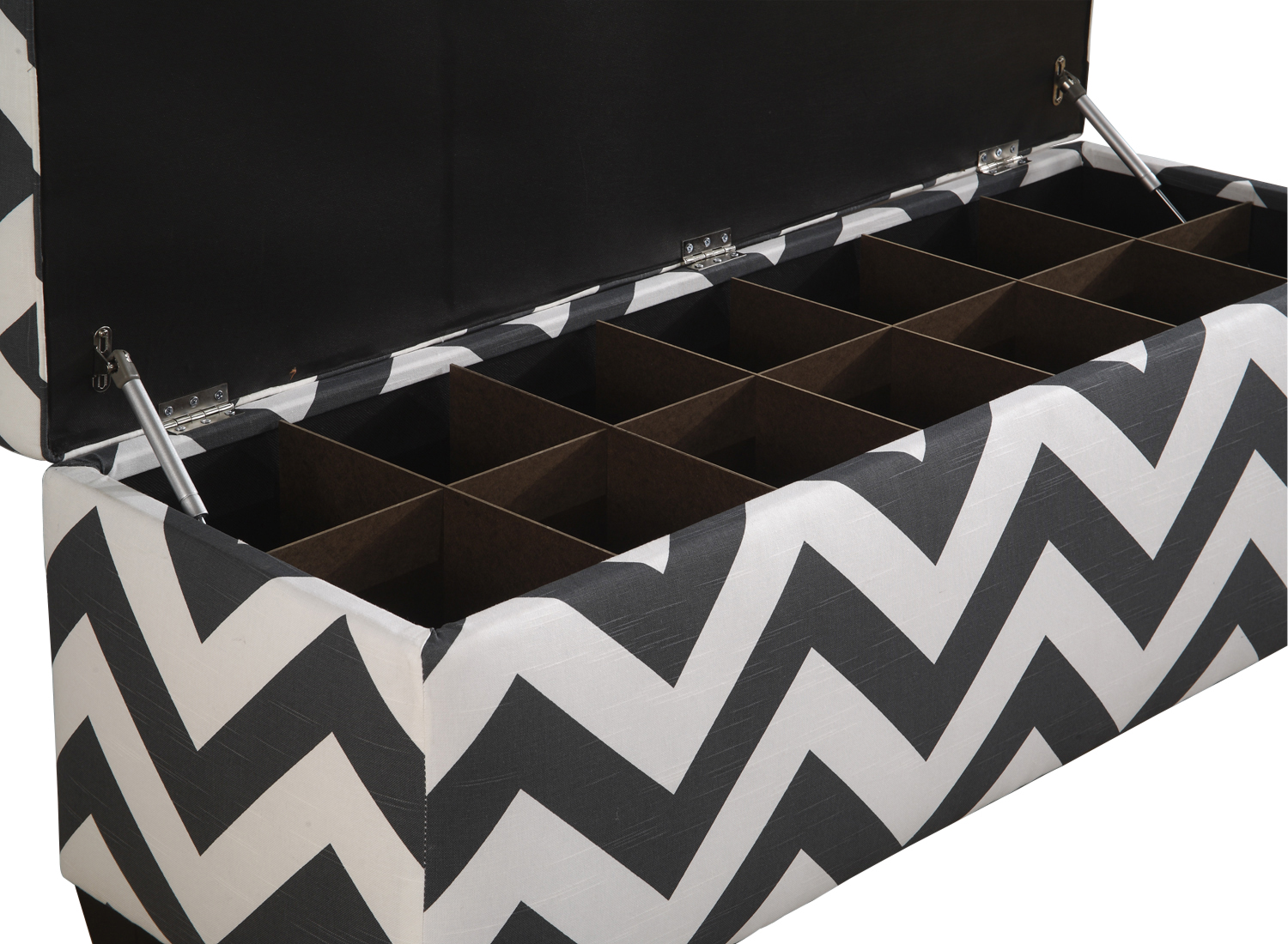 Modernize your home with this beautiful and well-built shoe storage bench for bedroom, entryway or anywhere else in the house. Not only will this bench beautify your home, but it provides amazing storage options as well as occasional seating. Organizing shoes used to be a difficult chore that involved messy shoe racks or just a lot of clutter. Our shoe storage bench contains between 14 and 18 easily removable shoe slots that will allow you to organize and maximize your shoe storage. It can work for shoes, handbags or any type of clutter. Each shoe slot can hold up to a Men’s size 12 shoe or a Women’s size 14. Made of 100% polyester with a medium comfort level our bench is sure to accent any room its placed. Fuse utility and functionality into one solid, made in the USA, reliable and beautiful shoe storage bench. Our zippy charcoal pattern is a beautiful contrast that would be a perfect fit in the bedroom or living room. So say goodbye to the old shoe rack and organize your shoes in style with The Sole Secret Shoe Storage Bench.